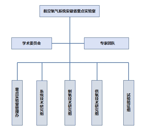 航空氧气系统安徽省重点实验室下设重点实验室管理办、系统技术研究组、制氧技术研究组,供氧技术研究组,试验验证组,并成立实验室学术委员会、专家团队,实验室主任1名,副主任1名,技术带头人、技术骨干等60余名。